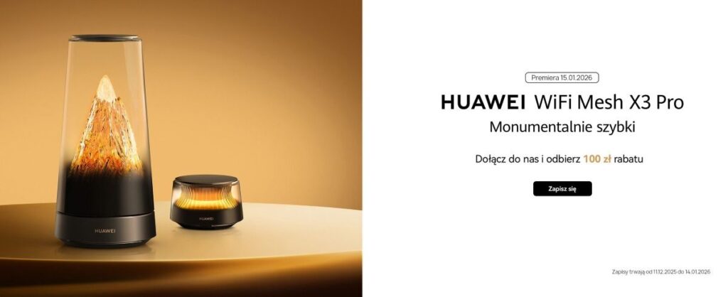 Z okazji zbliżających się premier na stronie huawei.pl można odebrać kupon rabatowy, obniżający cenę nowych słuchawek lub routera o 100 zł. W przypadku HUAWEI FreeClip 2, wystarczy do 21 stycznia 2026 r. zapisać się na listę mailingową na stronie https://consumer.huawei.com/pl/offer/audio/. Dla osób, które chcą skorzystać z kuponu rabatowego na HUAWEI WiFi Mesh X3 Pro, przygotowano oddzielny link do zapisania się do newslettera, co należy uczynić do 14 stycznia 2026 r.: https://consumer.huawei.com/pl/offer/routery/.
