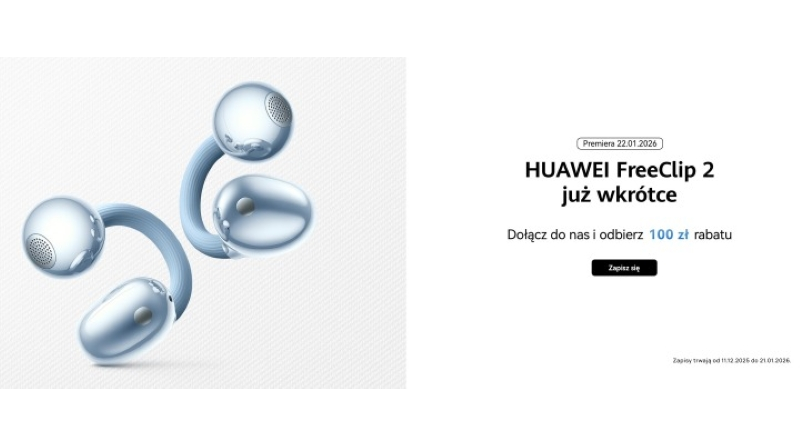 Podczas globalnej premiery pod hasłem „Unfold the Moment”, marka Huawei zaprezentowała HUAWEI FreeClip 2 – drugą generację słuchawek zaprojektowanych do noszenia przez cały dzień, które już 22 stycznia 2026 r. pojawią się w Polsce. Przy okazji wydarzenia zaprezentowano także najnowszy składany smartfon klasy premium – HUAWEI Mate X7, ulepszony tablet HUAWEI MatePad 11.5 S 2026 oraz absolutnie oszałamiający wykonaniem i możliwościami smartwatch HUAWEI WATCH ULTIMATE DESIGN. Marka zapowiada także premierę eleganckiego routera HUAWEI WiFi Mesh X3 Pro. Z okazji zbliżających się premier na stronie huawei.pl można zapisać się na ofertę dla najszybszych i otrzymać ekskluzywne kupony rabatowe na wybrane produkty.