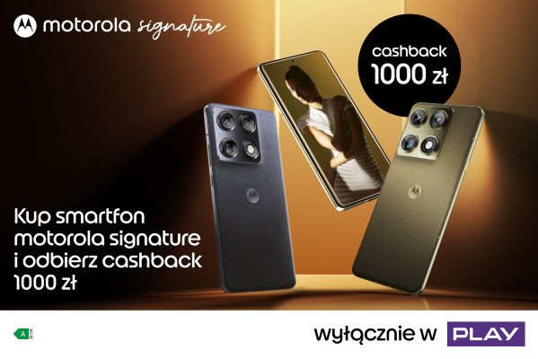 Promocja na model motorola signature dostępna jest wyłącznie w sieci Play. Po zakupie urządzenia (do 8 maja 2026 roku) i rejestracji na stronie cashback.motopromocja.pl klient może otrzymać 1000 zł zwrotu w formie przelewu na wskazane konto. Cena urządzenia w Play, przykładowo z abonamentem L i w ratach 0% wynosi 3299 zł, natomiast bez abonamentu to 4299 zł. Szczegółowe warunki i ograniczenia akcji promocyjnej określone są w regulaminie.