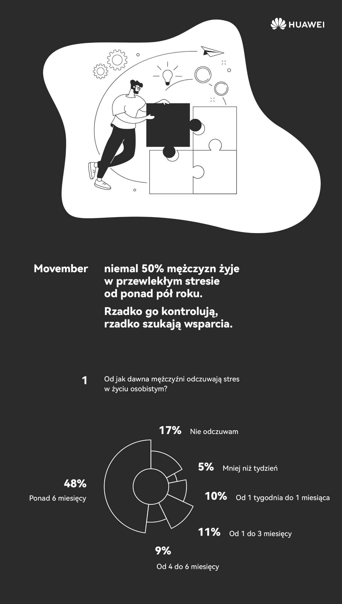 Movember, czyli globalna, coroczna kampania społeczna odbywająca się w listopadzie zachęca mężczyzn do zwrócenia szczególnej uwagi na ich zdrowie – także psychiczne. Jak wynika z badania przeprowadzonego przez Huawei CBG Polska[i], niemal połowa (48%) panów żyje w przewlekłym stresie, od co najmniej 6 miesięcy martwiąc się o swoje życie prywatne. Największymi problemami są dla nich rosnące koszty utrzymania (39%), problemy zdrowotne (29%), finansowe (28%) i w życiu rodzinnym (26%). Na to nakładają się kłopoty w życiu zawodowym – co trzeci pracujący Polak (37%) przyznaje, że w pracy doświadcza wysokiego poziomu napięcia. Czy w dzisiejszym tempie życia panowie mogą znaleźć moment na odpoczynek i zadbanie o swój dobrostan?