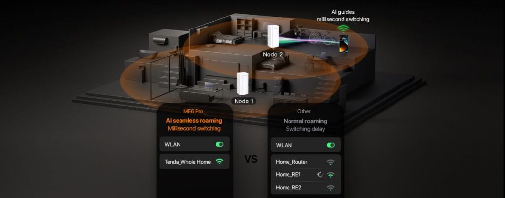 System Tenda ME6 Pro wyposażony został także w wewnętrzne anteny z algorytmem pozycjonującym, który wykorzystuje AI. Umożliwiają one lepsze wykrywanie urządzeń końcowych. Jedna z anten to specjalna antena międzywarstwowa (cross-layer). Pozwala ona na to, by sygnał mocniej przenikał przez ściany i sufity.