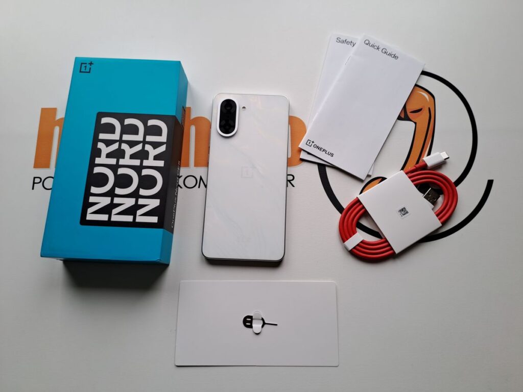 W ładnym i solidnym niebieskim pudełku, oprócz tytułowego smartfona OnePlus NORD CE5, znajdziemy trochę papierologii typu podstawowa instrukcja i informacje o telefonie, charakterystyczny dla marki OnePlus czerwony kabel (typu A na typ C) oraz igłę do tacki na karty sim.