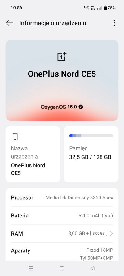 Wielkość 6,77″, rozdzielczość 2392 x1080 px, 387 ppi, AMOLED. Ekran cechują bardzo dobre kąty widzenia oraz kolory, a szczytowa jasność ekranu według danych producenta wynosi 1430 nitów, co oznacza dobry komfort podczas użytkowania, choćby w pełnym słońcu. Ponadto mamy tu: sRGB, tryb P3 wyświetlacza, 10-bitowa głębia kolorów, HDR10+, Certyfikat Netflix HD i HDR, Certyfikat Amazon Prime Video HD i HDR. Oglądanie filmów, przeglądanie stron internetowych, zdjęć, granie na takim ekranie jest bardzo przyjemne. Ekran posiada systemem Aqua Touch co ułatwia jego użytkowanie mokrymi lub tłustymi palcami. Ponadto możemy korzystać z wielu dodatkowych ustawień systemowych. Moim zdaniem ekran smartfona OnePlus NORD CE5 to jego kolejny plus.