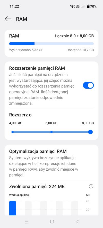 W środku mamy procesor MediaTek Dimensity 8350 Apex oraz procesor graficzny Arm Mali-G615 MC6. Do tego pamięć RAM 8GB i co na pewno warto podkreślić RAM: LPDDR5X oraz w zależności od konfiguracji pamięć wewnętrzną 128 lub 256GB UFS 3.1. Warto wspomnieć, że w systemie istnieje opcja rozszerzenia pamięci RAM o kolejne 4/6/8GB. A obsługiwana dodatkowo karta MicroSD może mieć pojemność do 1 TB.