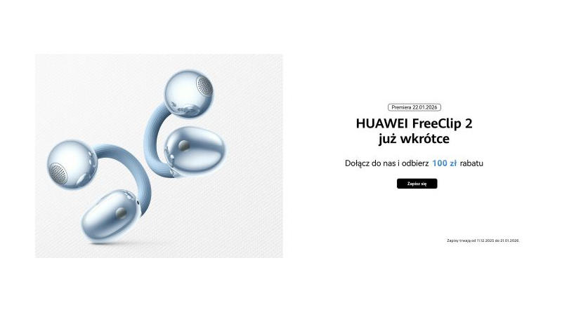 Już 22 stycznia 2026 r. w Polsce pojawią się HUAWEI FreeClip 2 – słuchawki zaprojektowane do noszenia przez cały dzień, które łączą innowacyjną technologię z otwartą, niezwykle wygodną konstrukcją douszną i eleganckim designem. Z okazji zbliżającej się premiery na stronie huawei.pl można odebrać kupon rabatowy, obniżający cenę słuchawek o 100 zł.