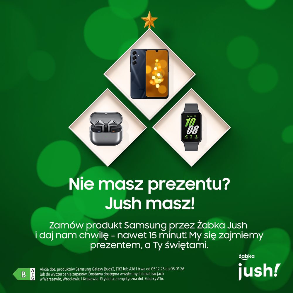 Prezenty na ostatnią chwilę to nasza specjalność. Najnowsze dane pokazują, że coraz częściej odkładamy zakup upominków na później – jedna na trzy osoby deklaruje, że robi je spontanicznie, bez wcześniejszych przygotowań, a 9% zaczyna kompletować prezenty dopiero w ostatniej chwili[1]. Równocześnie elektronika użytkowa wciąż cieszy się popularnością jako pomysł na prezent – blisko połowa z nas wybiera ją dla najbliższych pod choinkę[2]. Aby ułatwić organizację świątecznych przygotowań, Samsung i Żabka Jush udostępniają teraz możliwość zamówienia wybranych urządzeń Galaxy z szybką dostawą pod wskazany adres, realizowaną na określonych obszarach Warszawy, Wrocławia i Krakowa.