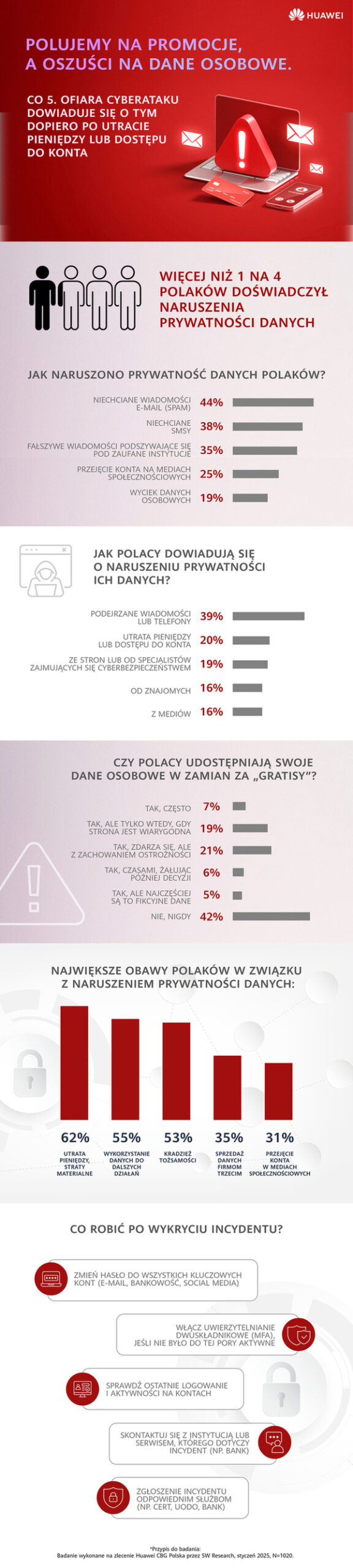 W przypadku naruszenia prywatności danych, 64% poszkodowanych zmienia hasła, 37% kontaktuje się z firmą, w której doszło do incydentu, a 31% decyduje się na usunięcie konta. Jedynie co czwarta osoba (23%) korzysta z narzędzi do monitorowania bezpieczeństwa danych, takich jak BIK. Brak reakcji deklaruje tylko 4% badanych. Największe obawy dotyczą utraty pieniędzy i strat materialnych (62%), wykorzystania danych do dalszych działań, np. zaciągnięcia pożyczki (55%) oraz kradzieży tożsamości (53%). Sprzedaży danych firmom trzecim obawia się przeszło co 3 Polak (35%), a przejęcia konta w mediach społecznościowych 31%.