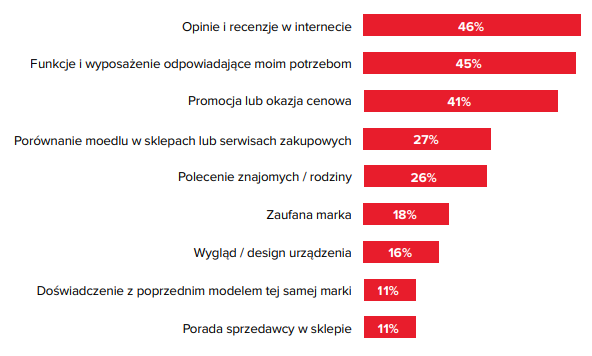 Badanie pokazuje, że decyzje zakupowe są przede wszystkim świadome i oparte na analizie technologii. Największy wpływ mają opinie i recenzje w internecie (46%) oraz dopasowanie funkcji do indywidualnych potrzeb użytkownika (45%). Promocje i okazje cenowe liczą się dla 41% Polaków, a co czwarty korzysta z porównań modeli (27%) lub rekomendacji znajomych (26%). Na dalszym planie pozostają czynniki emocjonalne, takie jak wygląd urządzenia (16%) czy wcześniejsze doświadczenia z marką (11%). To wyraźny sygnał, że konsumenci wybierają roboty przede wszystkim za ich możliwości technologiczne i realną funkcjonalność, a nie wyłącznie atrakcyjny design czy rozpoznawalność producenta.