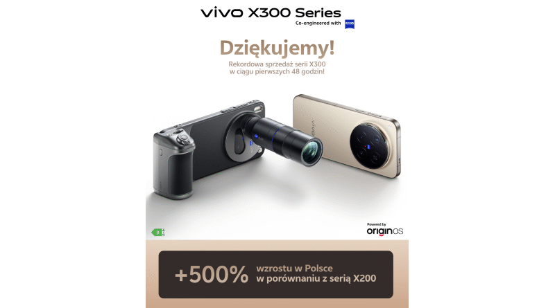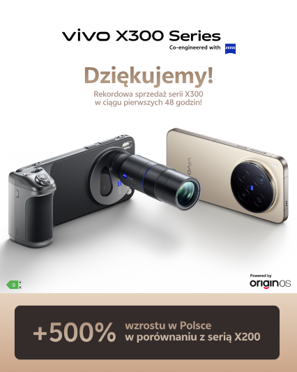 Seria fotograficznych smartfonów vivo X300 cieszy się ogromnym zainteresowaniem w całej Europie – a w Polsce szczególnie. W ciągu pierwszych 48 godzin od startu sprzedaży nowe modele odnotowały ponad 500% wzrost sprzedaży w porównaniu z serią X200. To wynik, który potwierdza rosnącą pozycję marki vivo w segmencie premium na polskim rynku.