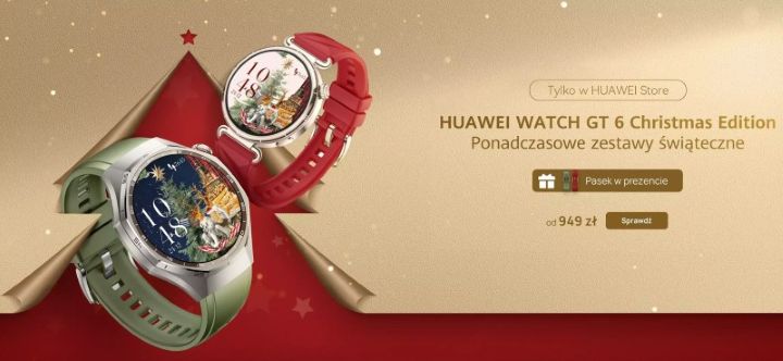 Jak co roku, oficjalny sklep marki przygotował również edycje świąteczne wybranych modeli zegarków, czyli wersje z dodatkowym czerwonym lub zielonym paskiem w prezencie. Taki zestaw dostępny jest wyłącznie na huawei.pl, a klienci mają do wyboru następujące modele oznaczone jako Christmas Edition: