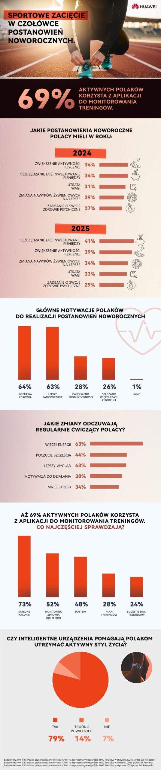 Nowy rok to dla wielu z nas moment podsumowań i planowania zmian. Jak pokazuje badanie Huawei CBG Polska, wśród noworocznych postanowień Polaków od lat czołowe miejsca zajmują cele związane z aktywnością fizyczną. W 2024 roku co trzeci z nas (34%) planował poprawę swojej dawki ruchu, a w 2025 roku to samo deklarowało już niemal 40% Polaków[i]. Co istotne, najchętniej wybieramy proste formy aktywności – spacer (73%), jazdę na rowerze (54%) i bieganie (29%)[ii]. Coraz częściej w utrzymaniu regularności pomagają nam inteligentne technologie: smartwatche, słuchawki czy aplikacje, które zdaniem aż 79% badanych realnie wspierają systematyczność ćwiczeń, a co za tym idzie – mogą pomóc w realizacji postanowień noworocznych.